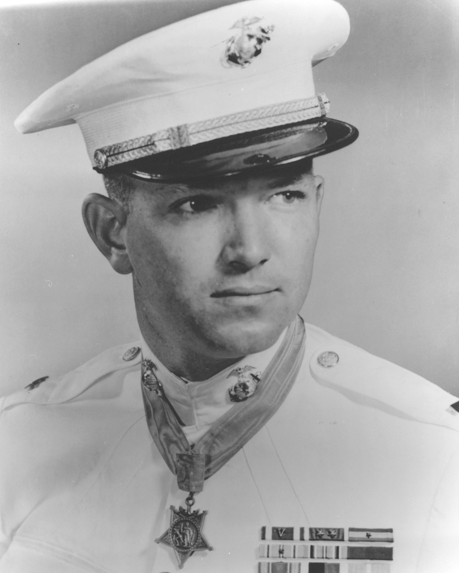 For conspicuous gallantry and intrepidity at the risk of his life above and beyond the call of duty while serving with the First Battalion, Twenty-sixth Marines, Fifth Marine Division, during action against enemy Japanese forces on Iwo Jima, Volcano Islands 20 February 1945. While creeping through a treacherous, twisting ravine which ran in close proximity to a fluid and uncertain front line on D-plus-1 Day, Private First Class Lucas and three other men were suddenly ambushed by a hostile patrol which savagely attacked with rifle fire and grenades. Quick to act when the lives of the small group were endangered by two grenades which landed directly in front of them, Private First Class Lucas unhesitatingly hurled himself over his comrades upon one grenade and pulled the other one under him, absorbing the whole blasting force of the explosions in his own body in order to shield his companions from the concussion and murderous flying fragments. By his inspiring action and valiant spirit of self-sacrifice, he not only protected his comrades from certain injury or possible death, but also enabled them to rout the Japanese patrol and continue the advance. His exceptionally courageous initiative and loyalty reflect the highest credit upon Private First Class Lucas and the United States Naval Service.